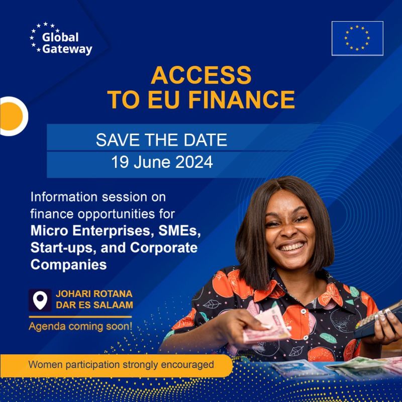 The European Union Delegation in Tanzania and its private finance partners, will organise on 19 June in Dar es Salaam, a workshop on finance opportunities provided by the European Union. The one day event will include sessions dedicated to categories of private sector actors, such as micro-enterprises, SMEs, start-ups and large companies. The EU and its partners will present the different finance offers, their eligibility requirements and engage in short discussions with the audience. Main EU partners participating are the European Investment Bank, European Development Financing Institution Association, the German Development Bank (DEG), CRDB, etc.
